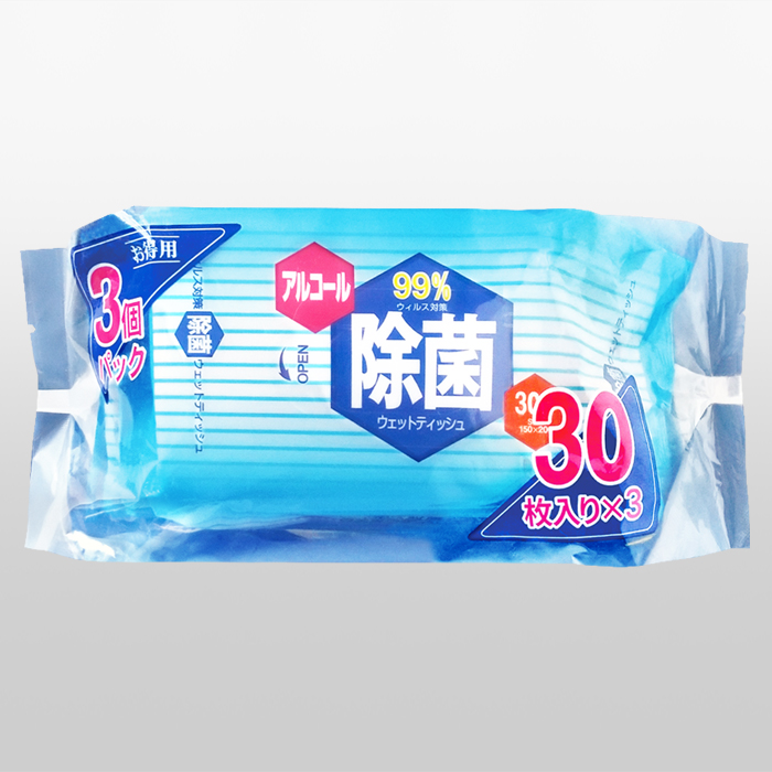 肌にやさしい拭き心地のよい柔らかシー トを使用。ウイルス対策99%除菌。お食事前の手の除菌、キッチンから外出先でお水がない時やスポーツ後の汗拭きにも使える多用途ウェットティッシュ。シートサイズは150mm×200mm。お買い得な30枚入りの3個パック。