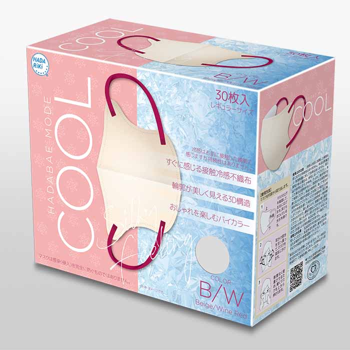 フェイスラインが美しい小顔効果の3層3Dバイカラーマスクにすぐに感じる接触冷感機能をプラス。高機能フィルター、ウイルス飛沫や花粉をブロックするメルトブロー不織布など充実の7つの機能。肌触りの良さとお肌に馴染みやすい明るいカラーも好評。不動の定番カラー、ベージュ✕ワインレッド。