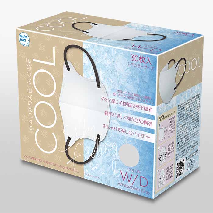 フェイスラインが美しい小顔効果の3層3Dバイカラーマスクにすぐに感じる接触冷感機能をプラス。高機能フィルター、ウイルス飛沫や花粉をブロックするメルトブロー不織布など充実の7つの機能。肌触りの良さとお肌に馴染みやすい明るいカラーも好評。 使い勝手の良いホワイト✕ダークグレー。
